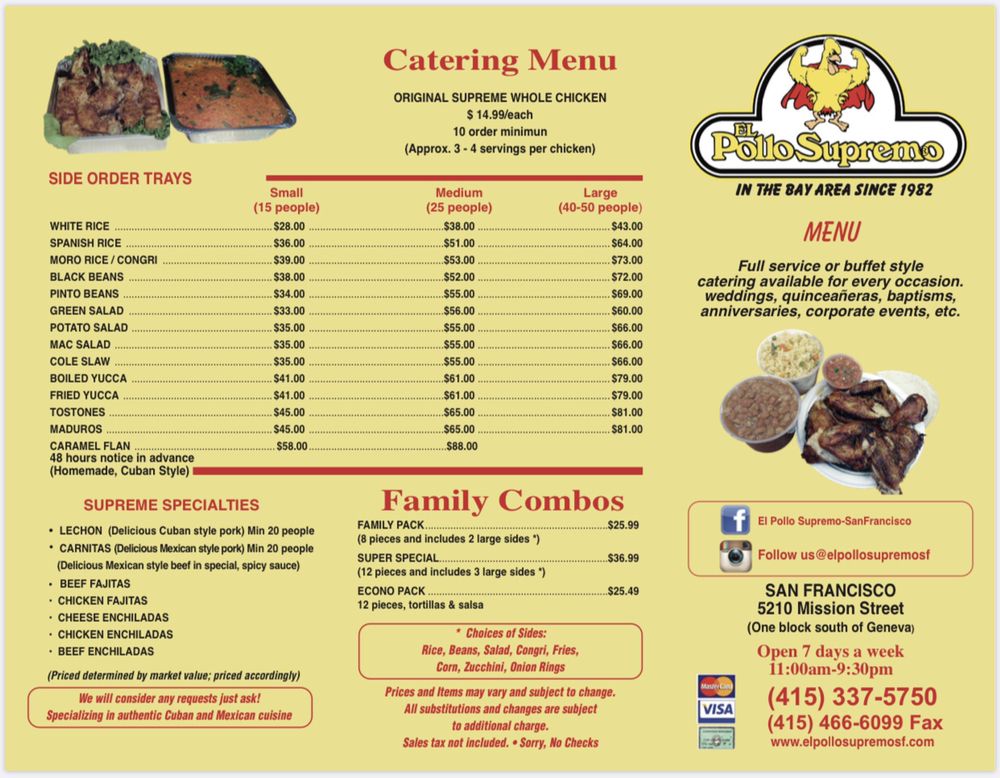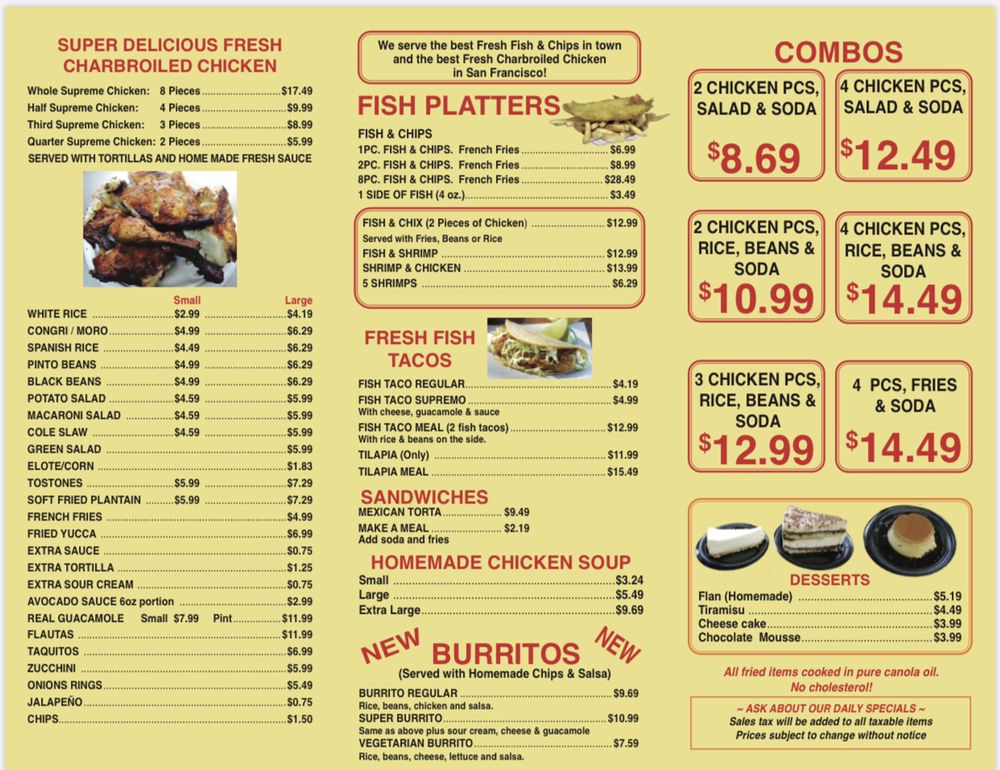 El Pollo Supremo, located in San Francisco, offers a range of Latinx-owned dishes, including the famous charbroiled chicken served with tortillas and fresh homemade sauce. The restaurant provides a casual dining experience with options for delivery, takeout, and reservations. Customers praise the well-seasoned grilled chicken, black beans, and flavorful salsa. The menu features homemade chicken soup, various salads, and sides like fried plantains and yucca. Reviews highlight the generous portion sizes, friendly service, and nostalgic atmosphere of this beloved spot. With a focus on quality ingredients and authentic flavors, El Pollo Supremo is a go-to destination for delicious Latin American cuisine.